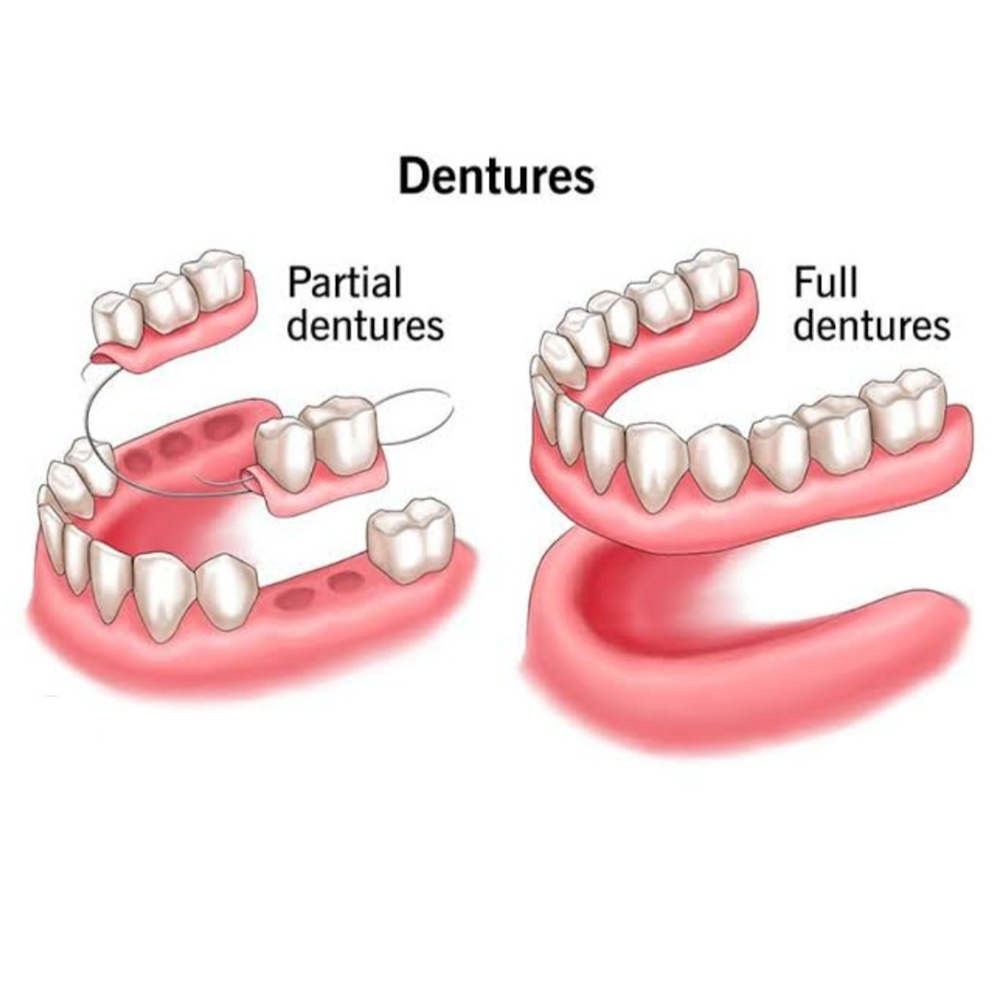 Removable false teeth made of acrylic or metal that fits over the gums or the implants to replace the all missing teeth or some teeth